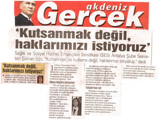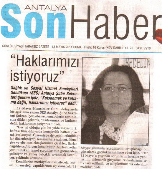 12 Mayıs Hemşireler Günü dolayısıyla SES Antalya Şube Sekreteri Şükran İçöz’ün yaptığı açıklamanın basına yansıyanlarının