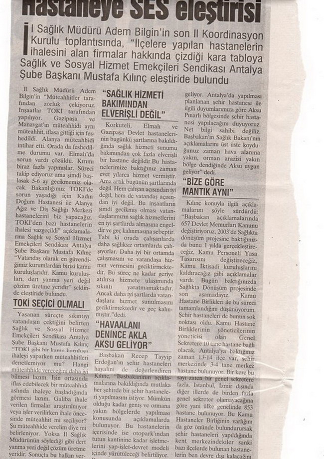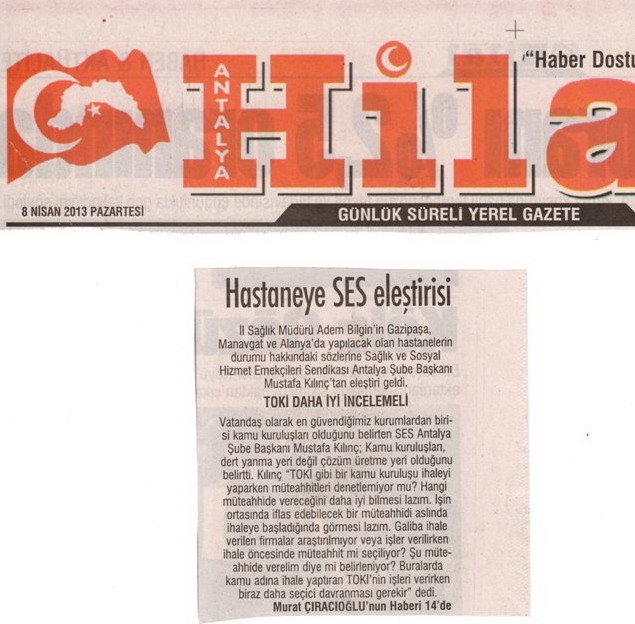 Bu açıklamalara tepki gösteren SES Antalya Şube Başkanı Mustafa Kılınç, “Merak ediyoruz madem Sağlık Bakanlığı kendisi hastane yapabiliyordu neden TOKi ile hastane yapımları için protokol yapıldı. Tamamlanamayacak hastanelerin tamamlanması için bu protokollerde Sağlık Bakanlığı lehine herhangi bir madde var mı? Nasıl oluyor da ihaleyi alan firma daha inşaat aşamasında iflas ediyor. TOKİ ihaleyi açarken şirketlerin yeterliliğini kontrol etmiyor mu? Yoksa ihaleler şartnamelere uygun firmalara değil de sadece iktidara yakınlığı olana firmalara mı veriliyor? İhaleler verildikten sonra inşaatlar yada inşaatları yapan firmalar mütahitler denetleniyor mu? Yarım kalan hastane inşaatların ücretleri yine halkımızın cebinden çıkıyor. Sağlık İl Müdürlüğü bunlardan şikayet edeceğine bu durumun hesabını TOKİ’den sormalıdır. TOKİ’ nin eline yüzüne bulaştırdığı işi neden Sağlık İl Müdürlüğü tamamlamaya çalışıyor. Sağlık İl Müdürü bu sorulara da cevap verirse seviniriz. Bizler de halkımızın daha iyi bir şekilde sağlık hizmeti alabilmesi için en iyi hastanelerin yapılmasını isteriz ama hastane yapacağız diye halkın ödediği vergilerin bu şekilde çarçur edilmesini doğru bulmuyoruz” dedi.