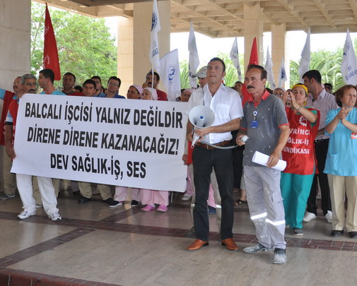 Akdeniz Üniversitesi Tıp Fakültesi Hastanesi A Blok Önünde toplanan sağlık emekçileri sık sık “Baskılar bizi yıldıramaz” “Balcalı emekçisi yalnız değildir” “Direne direne kazanacağız” sloganları attılar.