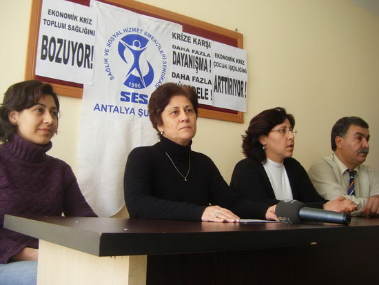 SES Antalya Şube Başkanı Nesrin Kocaemir, kriz dönemlerinin, işten çıkarmaların, güvencesiz ve kayıt dışı çalıştırmaların ve sosyal hak kayıplarının en çok yaşandığı dönemler olduğunu belirterek, işsizlik, gelir azalması, yoksulluğun artması gibi etkenler toplum sağlığını olumsuz etkileyecektir dedi.