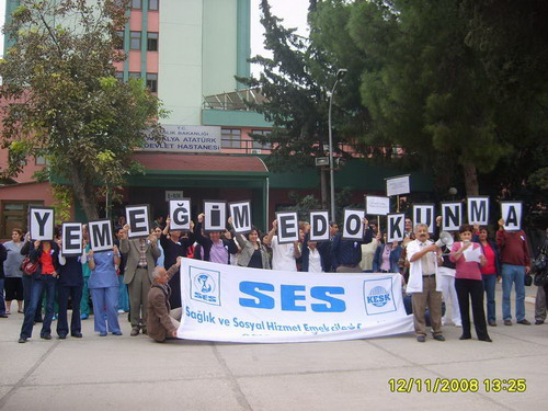 Ücretsiz olan öğle yemek hakkımız, Atatürk Devlet Hastanesi’nde de elimizden alınmak istenmektedir. Hastane yönetiminin 15 Kasım 2008’den itibaren hayata geçirmeyi planladığı uygulama gerçekleşirse maaşlarımızdan, her ay 15.84 YTL ile 57.20 YTL arasında kesinti yapılacaktır. Ücretsiz yemek hakkımızın gasp edilerek yemeklerimizin ücretlendirilmesi girişimi hiçbir şekilde kabul edilemez.