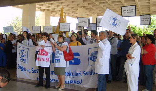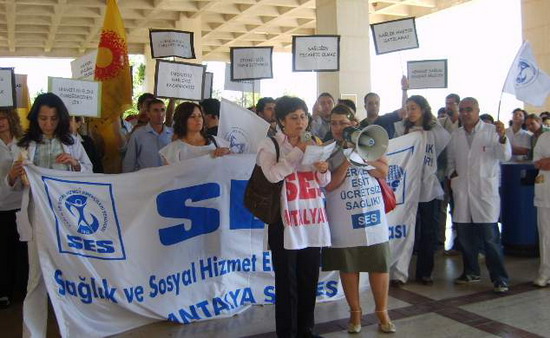 IMF’nin dayatmalarıyla sağlık hizmetini piyasalaştıran AKP hükümetinin “Sağlıkta Dönüşüm Programı” sağlık alanında tahribata devam ediyor. Sağlık ve sosyal hizmet emekçilerinin güvencesiz çalıştırılması yaygınlaştırılıyor, iş yükü giderek artıyor. İnsanca yaşama uygun koşullarımız düzeltileceğine, bunun aksine haklarımız birer birer elimizden alınmak isteniyor.