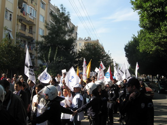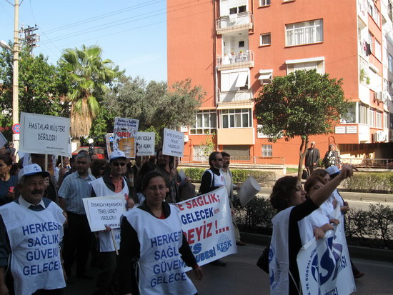 SES Antalya Şubesi önünde kendilerini bekleyen emekçiler ve desteğe gelenlerle sayıları ikibini geçen eylemciler saat:11.00’da üzerinde taleplerinin yer aldığı pankartlar açıp 'Krizin Faturasını Ödemeyeceğiz', Toplu Sözleşme Hakkımız Söke Söke Alırız” “Hükümet Şaşırma Sabrımızı Taşırma” “Gün Gelecek Devran Dönecek AKP Halka Hesap Verecek” yazılı dövizlerle ve sloganlarıyla yürüyüşe geçti.