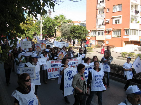 Sağlık ve sosyal hizmet emekçileri saat:10.10 civarında Tıp Fakültesi’nden yürüyüşe geçerek Eğitim Araştırma Hastanesi’ne geldiler. 10.30’da defterdarlığa doğru yürüyüşe geçerek burada eylemde olan büro emekçileri ile buluşan eylemciler, ellerindeki pankart ve dövizlerle sloganlar atarak TRT caddesi boyunca yürüdüler.