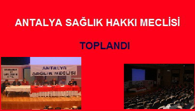Diş Hekimleri Odası salonunda toplandı. 11 Mart 2012 Pazar günü Ankara’da toplanacak Büyük Türkiye Sağlık Hakkı Meclisi’ne öncesi Antalya’da yapılacak etkinliklerin konuşulduğu toplantı’da 7 Mart 2012 Çarşamba günü “Sağlık Hakkı İçin Hep Birlikte Ankara’ya Gidiyoruz” teması ile bir basın açıklaması yapılması kararlaştırıldı. Ankara’ya gideceklerin biran önce isimlerini yazdırmalarının istendi.