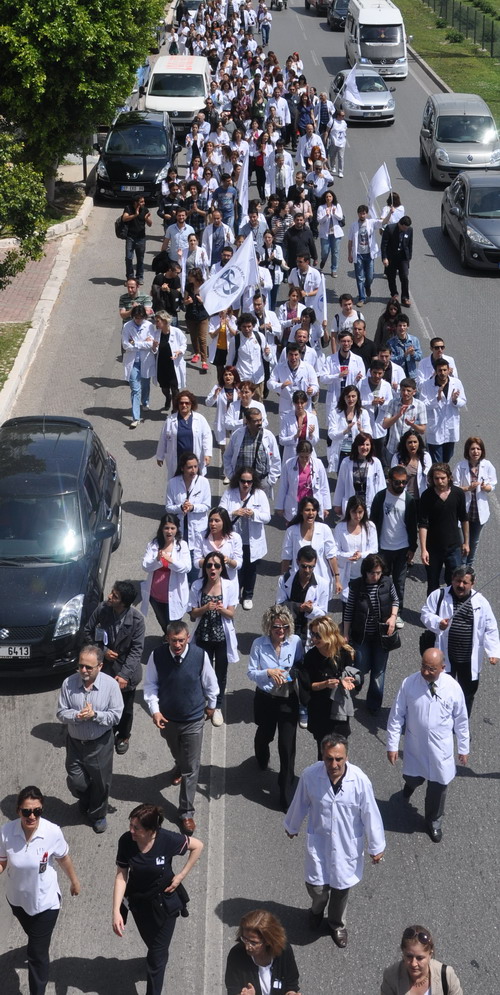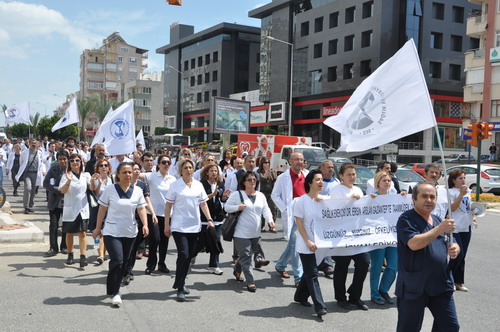 İş bırakarak Akdeniz Üniversitesi Tıp Fakültesi Hastanesi’nden yürüyüşe geçen yüzlerce sağlık ve sosyal