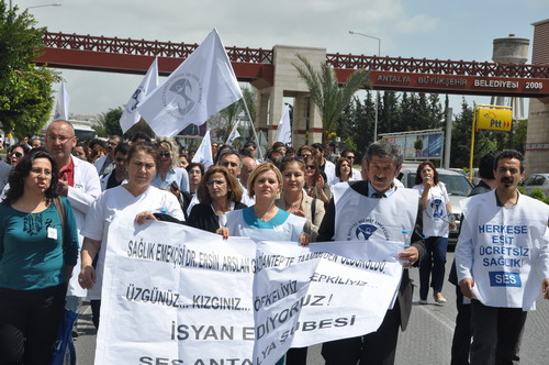 Sağlık ve Sosyal Hizmet Emekçileri Sendikası(SES) Antalya Şubesi’nin çağrısı ile bir araya gelen yüzlerce sağlık emekçisi adına İl Sağlık Müdürlüğü önünde basın açıklamasını SES Şube Başkanı Mustafa Kılınç okudu.