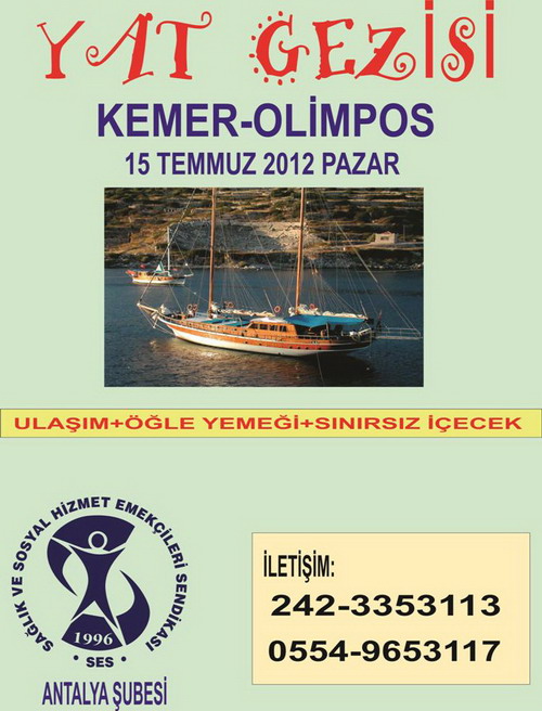 Şubemiz tarafından 15 Temmuz 2012 Pazar günü Kemer-Olimpos güzergahında Yat Gezisi düzenlenecektir.