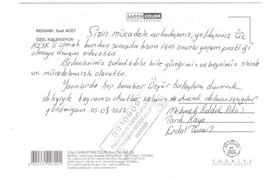 SES Antalya Şubemize bir bayram kartı gönderdi. "Bedenlerimiz tutsak edilse bile yüreğimiz ve beynimiz sizinle ve mücadelemizle olacaktır" diyerek tutm SES Antalya Şubesi üyelerinin bayramını kutladıklarını belirttiler.