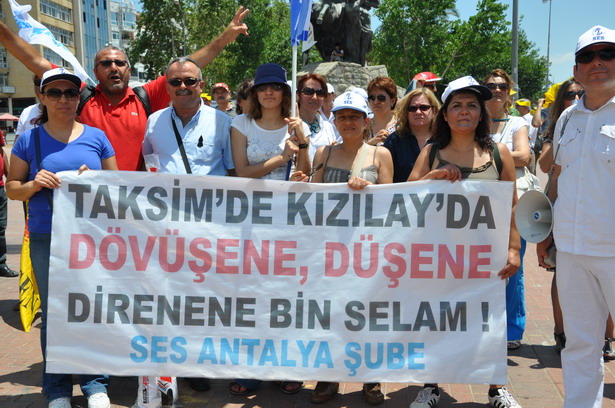 Aralarında SES Antalya Şube üyelerininde olduğu eylemciler Gezi direnişine destek olmak ve AKP faşizmini protesto etmek için sık sık “Faşizme Karşı Omuz Omuza” “Hükümet istifa”, “Her yer Taksim her yer direniş” sloganları attı.