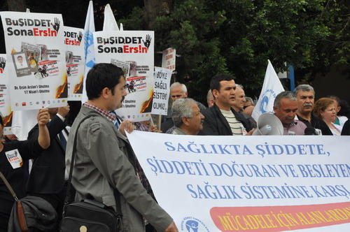 SES Antalya Şube Başkanı Mustafa Kılınç ve Çağdaş Hekimler adına Dr. Egemen Aktaş yaptıkları açıklamalarda "Dr.Ersin Arslan'ın ölüm yıldönümünde Sağlıkta Şiddete, Şiddeti Doğuran Ve Besleyen Sağlık Sistemine Karşı Mücadele İçin Alanlardayız" dediler.