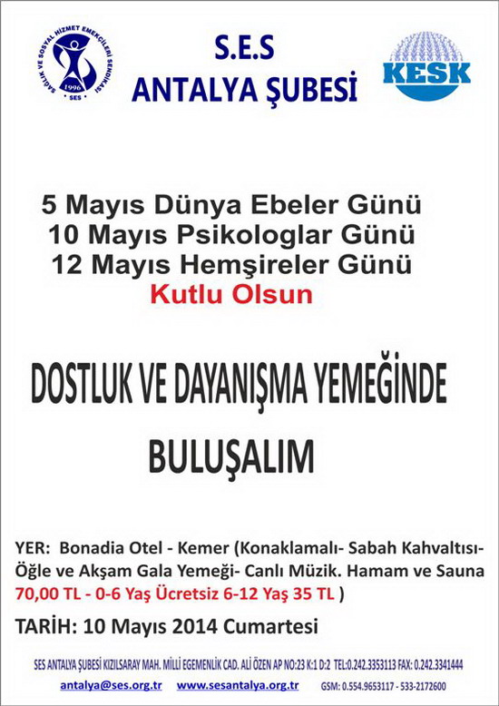SES Antalya Şubesi 10 Mayıs 2014 Cumartesi günü Kemer'de Dostluk ve Dayanışma