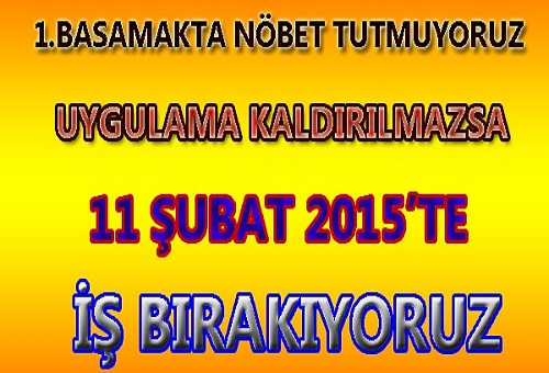 "Türkiye Halk Sağlığı Kurumu'nun 9 Aralık 2014 tarih ve 2014/33 sayılı genelgesi uyarınca Aile Sağlığı Merkezi ve Toplum Sağlığı Merkezi çalışanlarına Anayasanın 50. Maddesindeki dinlenme hakkına aykırı olarak zorunlu fazla çalışma getirilerek hafta sonları nöbet tutturulmasına, bu uygulamanın koruyucu sağlık hizmetleri ile 1. Basamak sağlık hizmetlerini olumsuz etkileyeceğinden dolayı 1 Ocak 2015'te başlayacak olan Cumartesi günleri yaptırılacak zorunlu nöbet uygulamasını YOK HÜKMÜNDE değerlendirdiğimizden dolayı NÖBETE GİDİLMEMESİ şeklinde işe gitmeme eyleminin yapılmasına, hafta sonu nöbetlerinin kaldırılmaması halinde 11 Şubat 2015 günü bir günlük İŞ BIRAKMA EYLEMİ yapılmasına karar verilmiştir."