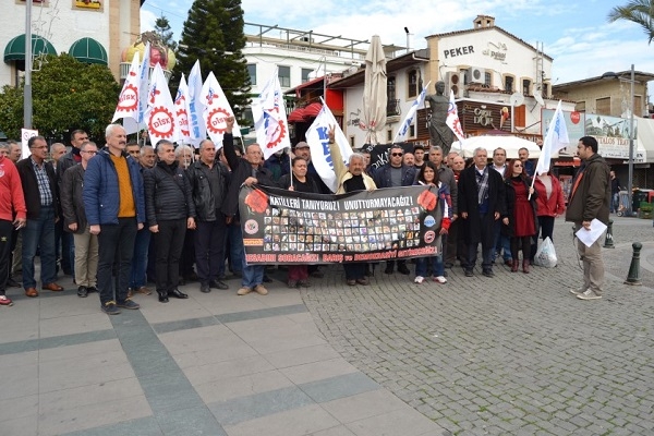 1 dakikalık saygı duruşuyla başlayan anmada ortak açıklamayı KESK Antalya Şubeler Platformu Dönem Sözcüsü Mustafa Ayar okudu.