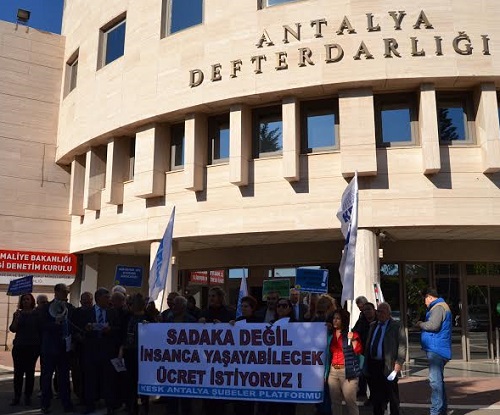 KESK Antalya Şubeler Platformu 2016-2017 yılları Toplu Sözleşme (TİS) sürecinde kamu emekçilerinin mali, demokratik ve sosyal taleplerini yok sayılmasını protesto etti. Antalya Defterdarlığı önünde toplanan KESK üyeleri adına basın açıklamasını KESK Antalya Şubeler Platformu dönem sözcüsü Mustafa AYAR yaptı. Mustafa AYAR'ın konuşmasının ardından KESK üyeleri verilen maaş artışlarını protesto için maaş bordrolarını yaktılar.