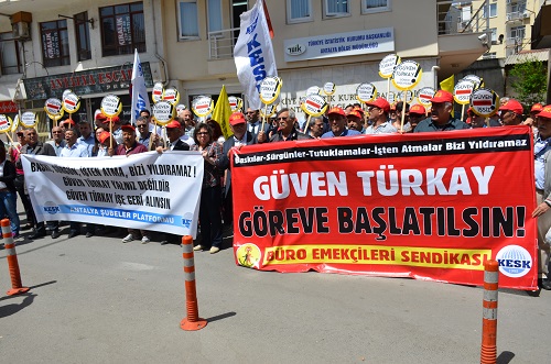 TÜİK Antalya Bölge Müdürlüğü önünde toplanan KESK üyeleri sık sık “Güven Türkay yalnız değildir, Güven Türkay işe geri alınsın, baskılar cezalar bizi yıldıramaz” sloganı attılar.
