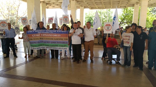 fiili hizmet süresi zammının ödenmesi için eylem yaptı. Akdeniz Üniversitesi Hastanesi A Blok önünde toplanan SES üyeleri adına basın açıklamasını SES Eş Genel Başkanı İbrahim Kara yaptı.