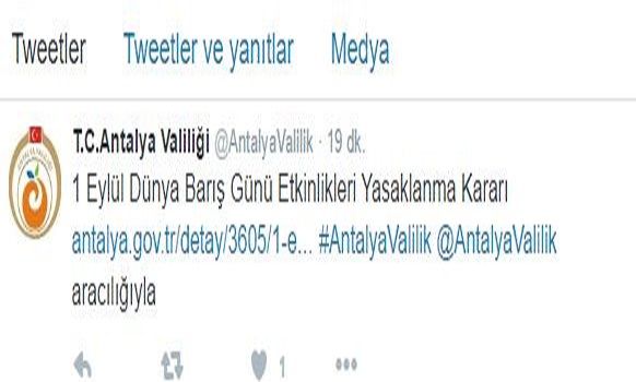 Antalya Emek ve Demokrasi Güçleri tarafından 1 Eylül Perşembe günü Aydın Kanza Parkından Cumhuriyet Meydanı'na yapılmak istenen 1 Eylül Dünya Barış Günü yürüyüşü Antalya Valiliğince yasaklandı. Valilik aynı adla 1 Eylül öncesi ve sonrasi il genelinde de her türlü etkinliği yasakladığını duyurdu. Yasak kararı tertip komitesine iletildi ve ayrıca Antalya Valiliğinin internet sitesinden de duyuruldu.