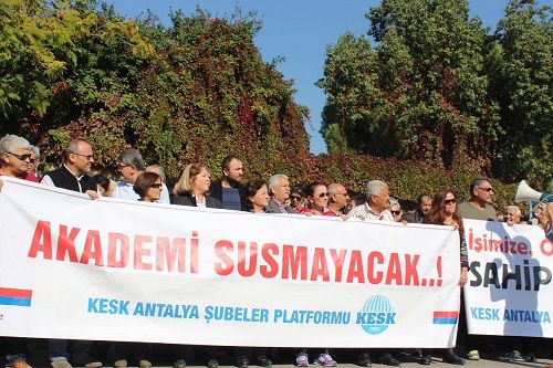 Üniversitedeki görevlerine son verilen Barış Akademisyenleri ve kamu emekçileri için KESK Antalya Şubeler Platformu Akdeniz Üniversitesi Meltem kapısı önünde basın açıklaması yaptı. Destek için akademisyenlerinde katıldığı açıklamada sık sık “Akademisi susmadı, susmayacak, Yaşasın demokrasi mücadelemiz, Barış hemen şimdi, OHAL'e hayır Demokratik Türkiye “sloganları atıldı. Açıklamayı KESK Antalya Şubeler Platformu adına Dönem Sözcüsü Kadir Öztürk okudu. Açıklamadan sonra görevine son verilen akademisyenler alkışlarla selamlandı.