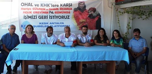 KHK ile ihraç edilen BES - Eğitim-Sen ve SES Antalya Şubesi üyesi kamu emekçileri, işlerine geri dönmek için açlık grevinde olan ve dün gözaltına alınan Nuriye Gülmen ve Semih Özakça ile dayanışma amacıyla 2 günlük açlık grevine başladı.