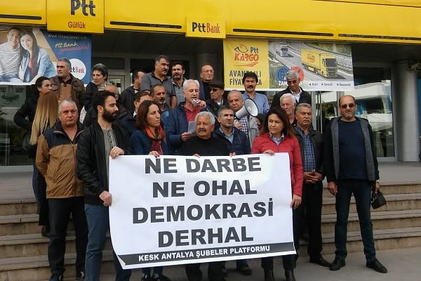 KESK Antalya Şubeler Platformu Güllük-PTT önünde yaptığı basın açıklamasıyla bir yıldır ihraç edilen kamu emekçileriyle ilgili hiçbir işlem yapmayan OHAL İnceleme Komisyonu’nu protesto etti.