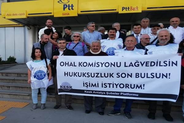 KESK Antalya Şubeler Platformu ihraç edilen yüz binlerce kamu emekçisinin ihraç başvurularını değerlendiren ve karar altına almakla yetkilendirilmiş olan OHAL İşlemlerini İnceleme Komisyonu’nun lağvedilmesini ve KHK ile ihraç edilen tüm kamu emekçilerinin görevlerine iadesi talebiyle bugün Güllük PTT önünde bir araya geldi.