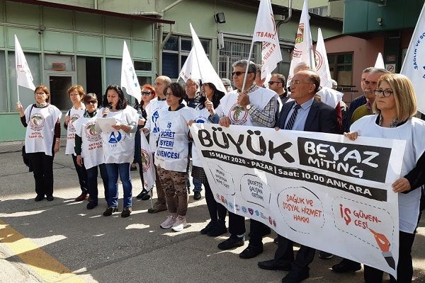 Antalya Sağlık Emek ve Meslek Örgütleri, Atatürk Devlet Hastanesi bahçesinde yaptıkları basın açıklaması ile 15 mart 2020 tarihinde Ankara’da düzenlenecek Beyaz Mitinge çağrı yaptılar.
