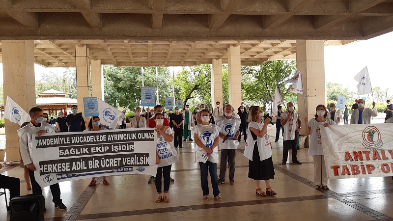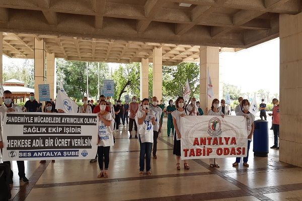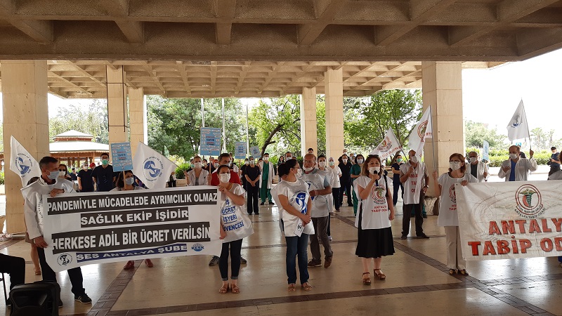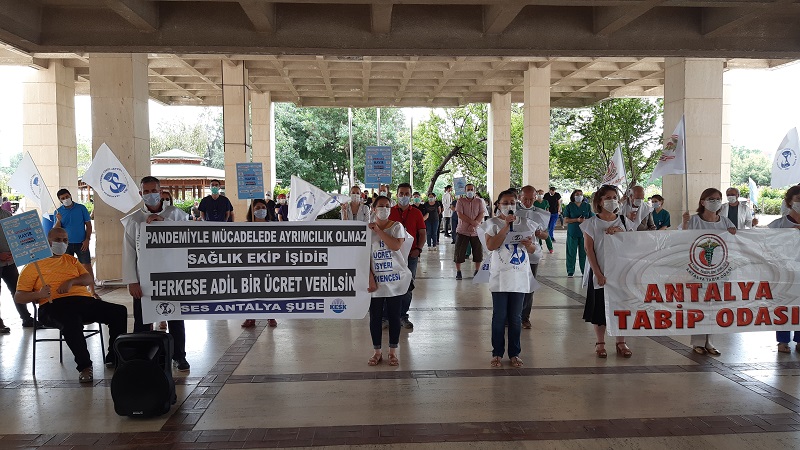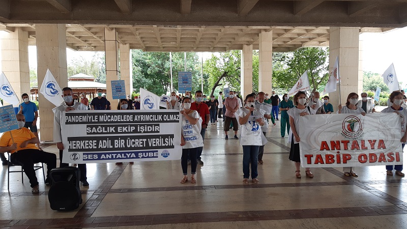 sağlık emekçilerinin talepleri için bir kez dada eylem yaptı. Geçen hafta olduğu gibi bu haftada Akdeniz Üniversitesi A Blok önünde toplanan SES üyeleri alkışlarla sağlık emekçilerinin taleplerini dikkate almayan Sağlık Bakanlığını protesto etti.