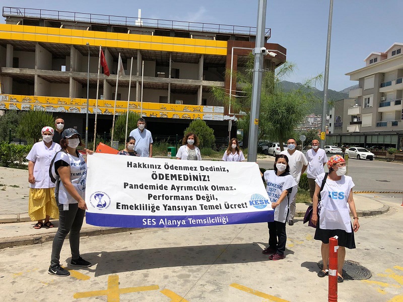 Salgın sürecinde Sağlık Bakanlığı’nın güya sağlık emekçilerini ödüllendirmek iddiası ile ortaya attığı "üç ay süreyle tavandan ödeme" uygulaması mevcut adaletsizliği daha da derinleştirmiş, salgın döneminde yeni sorunlar ekleyerek devam ettirmiştir. Salgındaki emeğimizi, aldığımız riski performans terazisi ile ölçmeye kalkanlar, alanda canla başla her türlü risk altında çalışan sağlık emekçilerini bir kez daha yıkıma uğratmıştır.