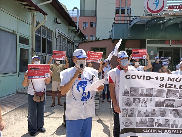 bahçesinde düzenlediği eylemde Covid-19 nedeniyle yaşamını yitiren sağlık emekçilerini andı, taleplerini açıkladı.
