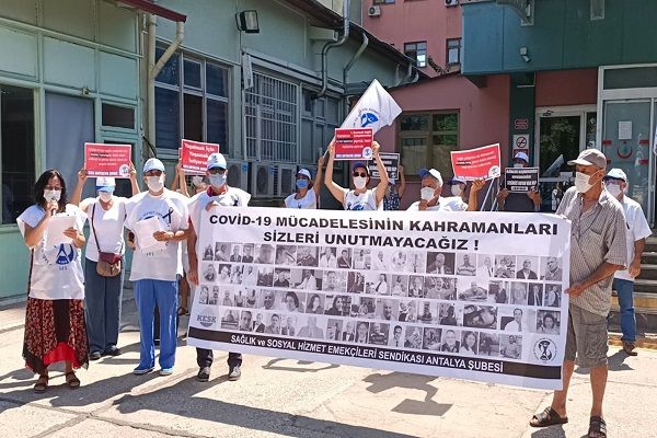 “COVİD Mücadelesinin Kahramanları Sizleri Unutmayacağız” pankartı açan SES üyeleri adına açıklamayı SES Antalya Şube Eş Başkanı Dr.Kaan Taşer yaparken, Antalya Tabip Odası Başkanı Prof.Dr.Nursel Şahin’de bir konuşma yaptı.