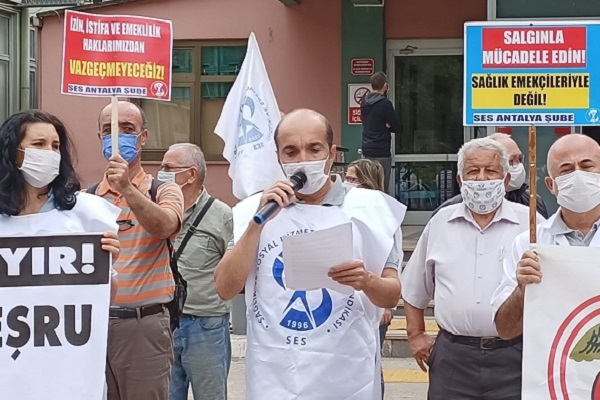 - Sağlık emekçileri adına ilk sözü Sağlık ve Sosyal Hizmet Emekçileri Sendikası Antalya Şubesi Eş başkanı Kaan Taşer aldı. Kaan Taşer Sağlık Bakanlığına seslenerek; Atama bekleyen binlerce sağlık emekçisinin derhal kadrolu, güvenceli ataması yapılmalıdır