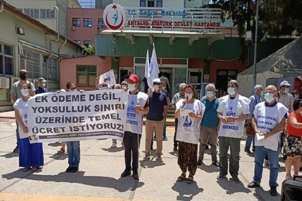 “ Covid-19 pandemisi nedeniyle İl Sağlık Müdürlüklerinde Yapılacak Ek Ödeme “genelgesine tepki gösterdiler. Atatürk Devlet Hastanesi önünde toplanan SES Antalya Şube üyeleri “ Ek ödeme değil, yoksulluk sınırı üzerinde temel ücret istiyoruz” pankartı açtı. SES üyeleri sık sık “ performans değil temel ücret, sağlık haktır satılmaz, yaşatmak için yaşamak istiyoruz” şeklinde sloganlar attı.