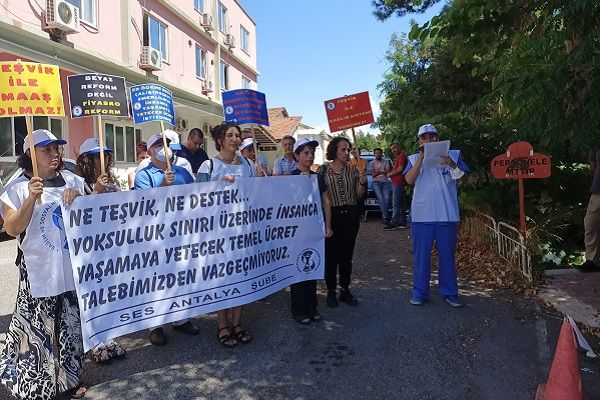 Sağlık ve Sosyal Hizmet Emekçileri Sendikası (SES) Antalya Şubesi Muratpaşa ilçe Sağlık Müdürlüğü önünde yaptığı eylemle Aile hekimliği Sözleşme ve Ödeme Yönetmeliğini protesto etti.