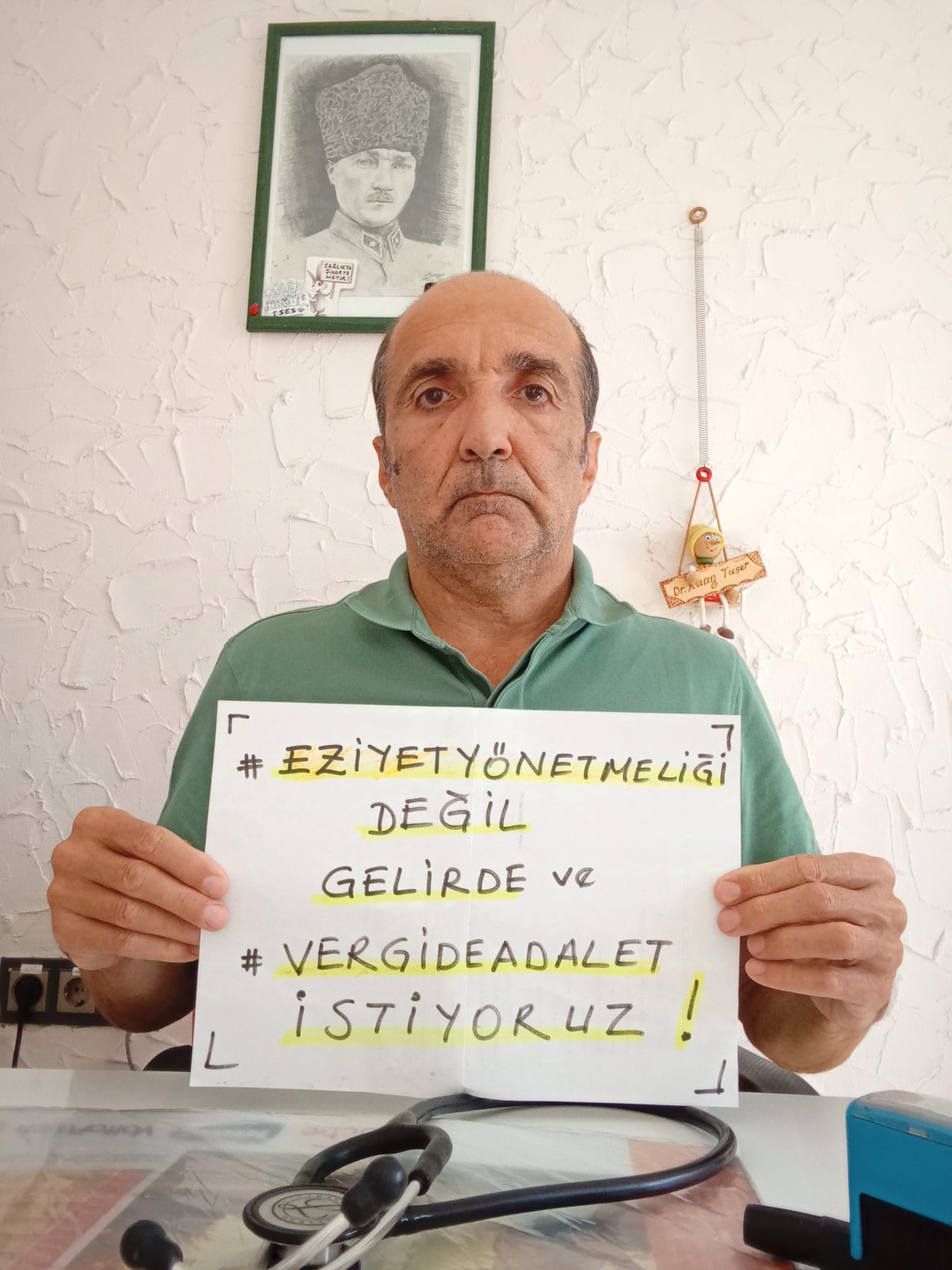 Dr. Kaan Taşer Bugün 30 Ekim 2024 Çarşamba. 34 haftadır vergide adalet talebimiz için ses çıkarmaya devam ediyoruz. Sadece vergide adalet için değil sağlıkta çeteleşmeye, ticarileşmeye, sağlık çalışanına durmak bilmeyen şiddete ve bunu besleyen aile hekimliğinde eziyet yönetmeliği gibi baskıcı mevzuat ve uygulamalara karşı mücadele ediyoruz dedi.