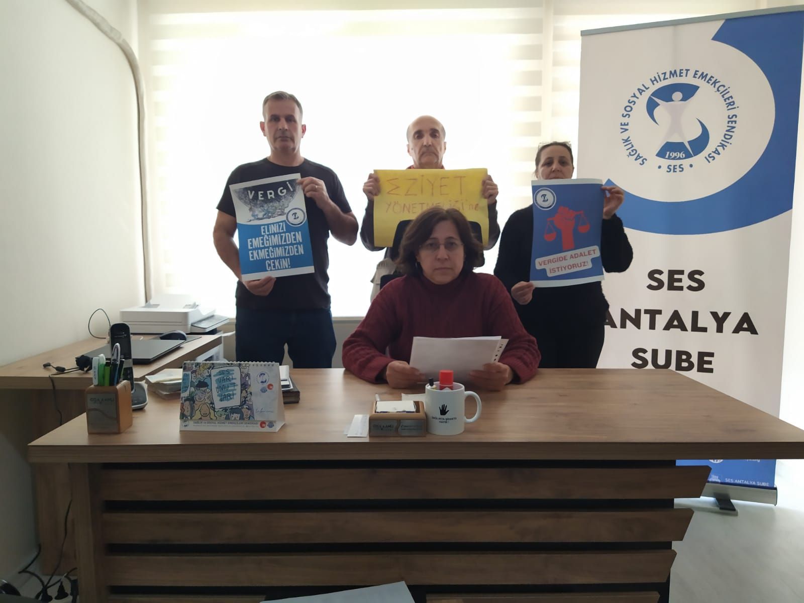Sağlık ve Sosyal Hizmet Emekçileri Sendikası (SES) Antalya Şubesi Eş Başkanı Şükran İçöz Vergide Adalet eyleminin 41. Haftası nedeniyle şube binasında basın açıklaması yaptı. Bugün 18 Aralık 2025 Çarşamba. Vergide adalet eylemlerimizin 41. Haftasındayız diyen Şükran İçöz Aile Hekimliği Eziyet yönetmeliğine karşı sürdürülen mücadele iki kez yapılan iş bırakma eylemlerine rağmen Sağlık Bakanlığının Kasım ayı ücret hesaplamalarında bile uygulayamadığı yönetmelik inadı yüzünden Aile hekimliği çalışanları 6 Ocak 2025 tarihinde bir kez daha 5 gün iş bırakma eylemi yapmak zorunda kalacak dedi.